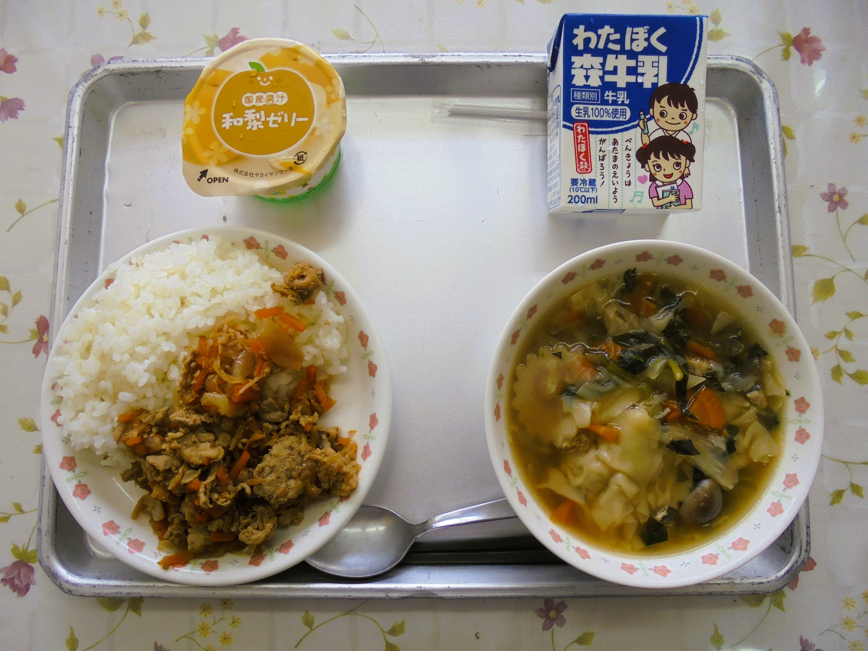 ・牛乳 ・豚キムチ丼 ・ワンタンスープ ・梨ゼリー |
