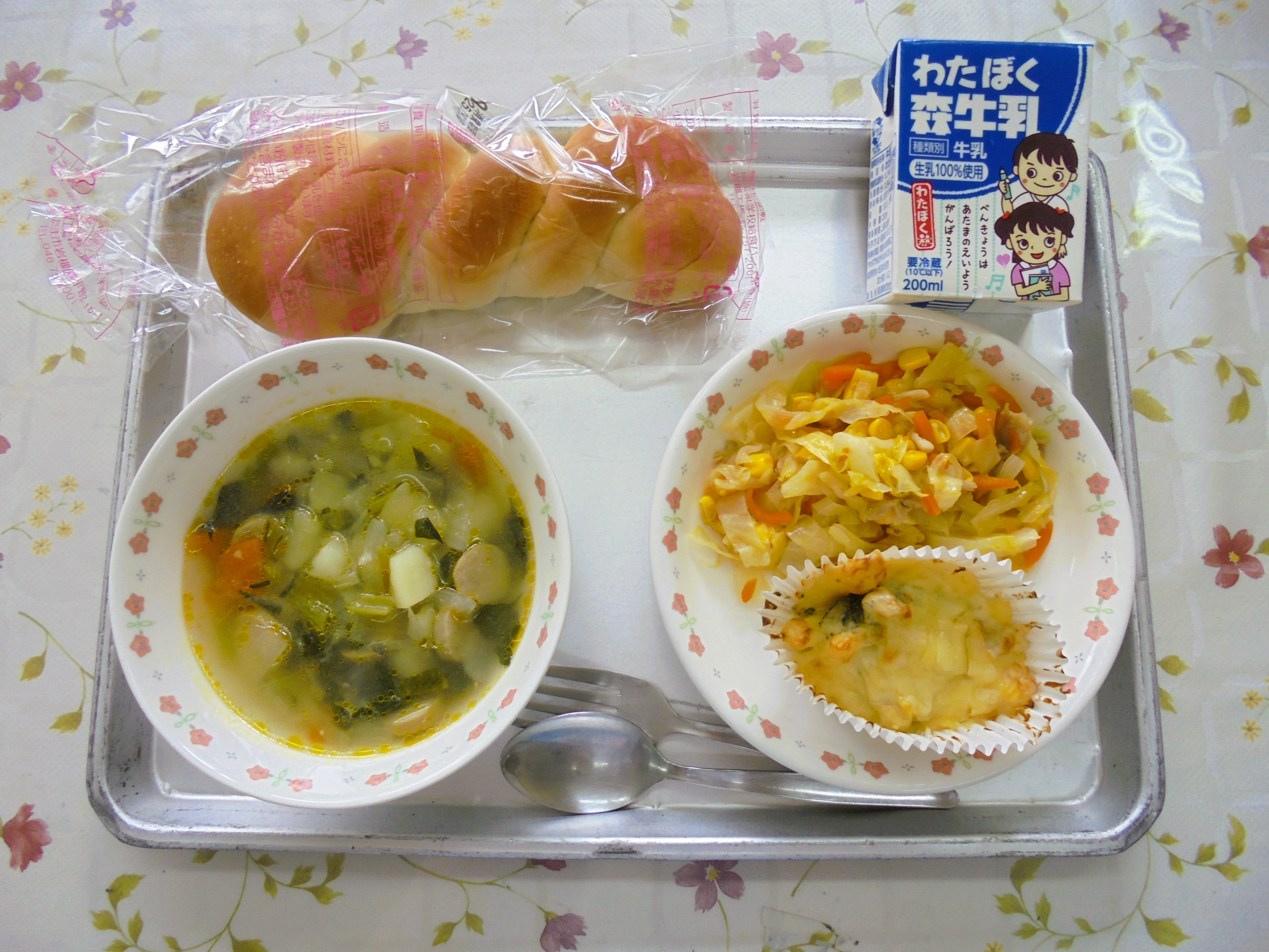キャベツがたくさん入ったみそ汁とホクホクのじゃがいもを使ったポテトとベーコンのチーズ焼きも一緒に、今日も残さず食べましょう。