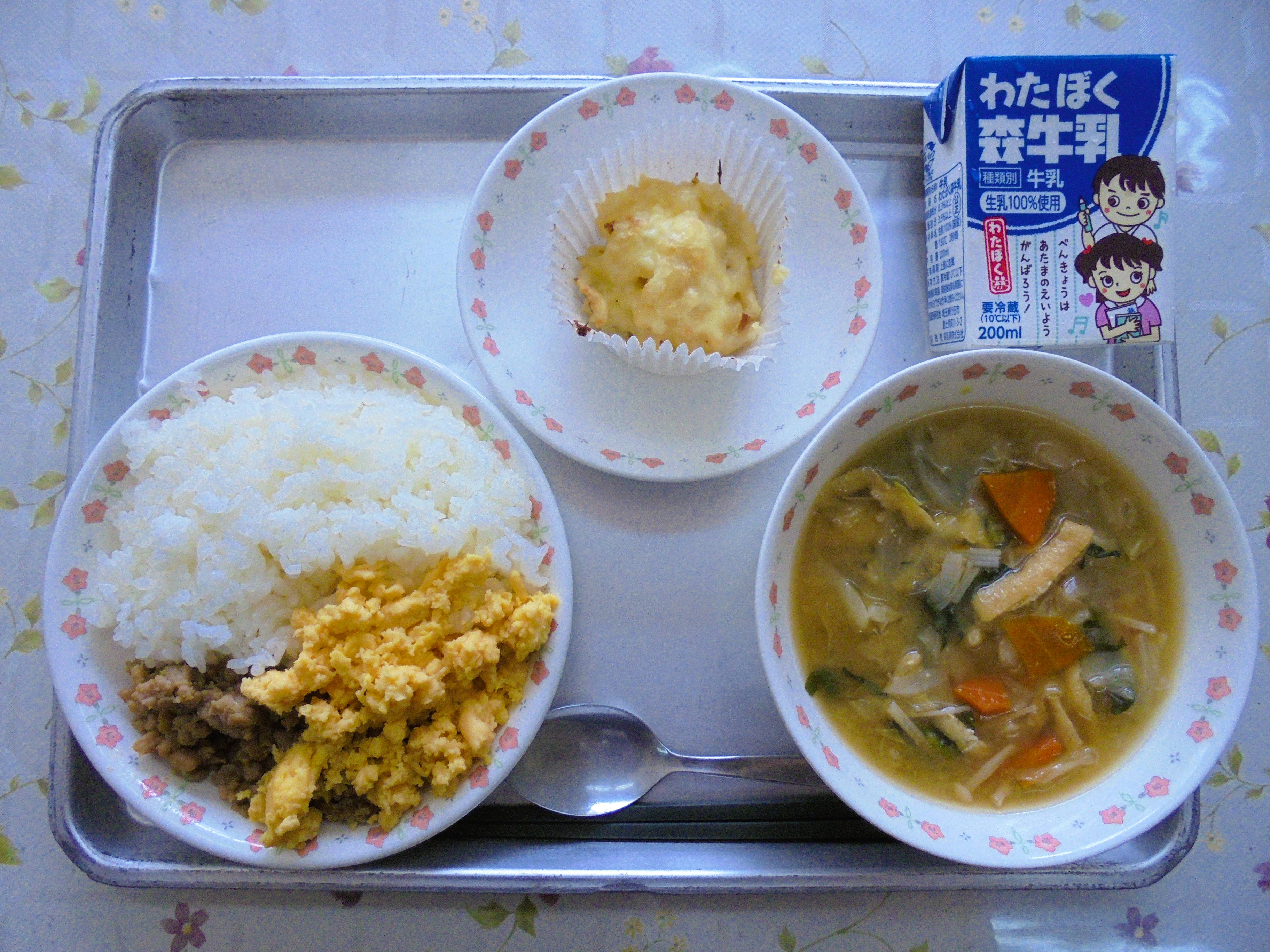 ・牛乳 ・2色そぼろ丼 ・キャベツのみそ汁 ・ポテトとベーコンのチーズ焼き |