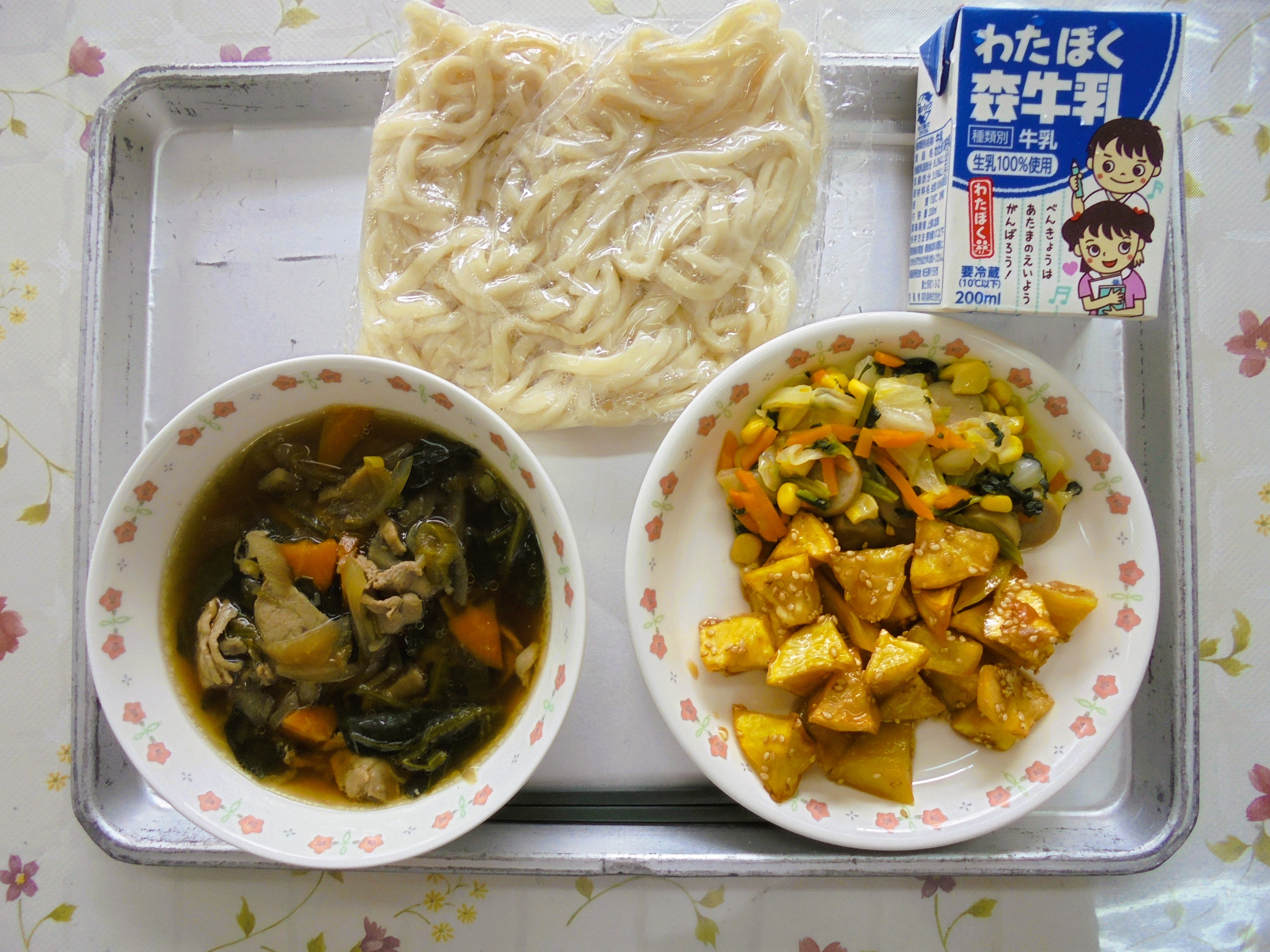 ・牛乳 ・地粉うどん ・肉うどん汁 ・大学芋 ・ウインナーとコーンのソテー |