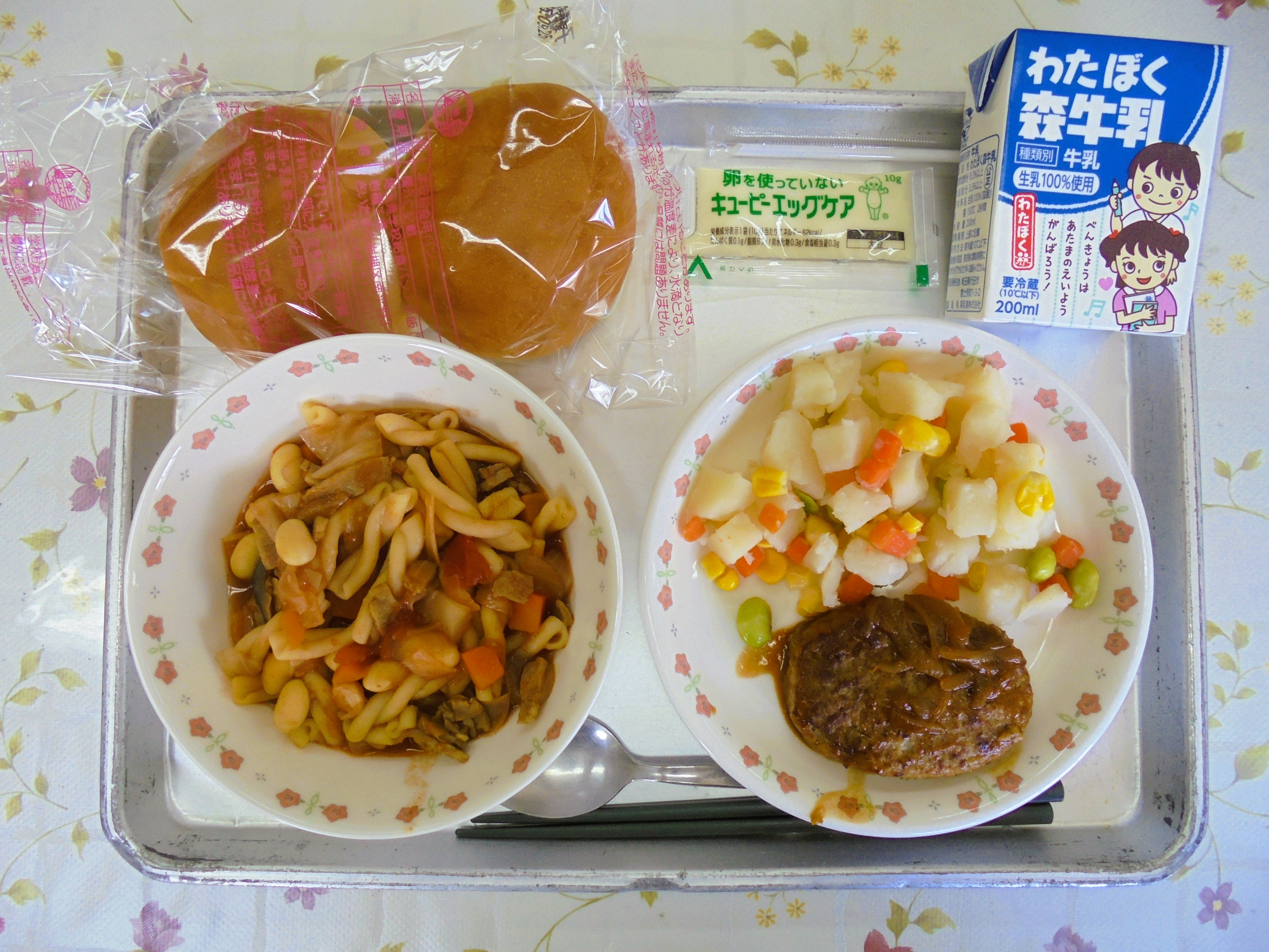 ・牛乳 ・子どもパン ・ミネストローネ ・ハンバーグデミグラスソース ・マセドアンサラダ |