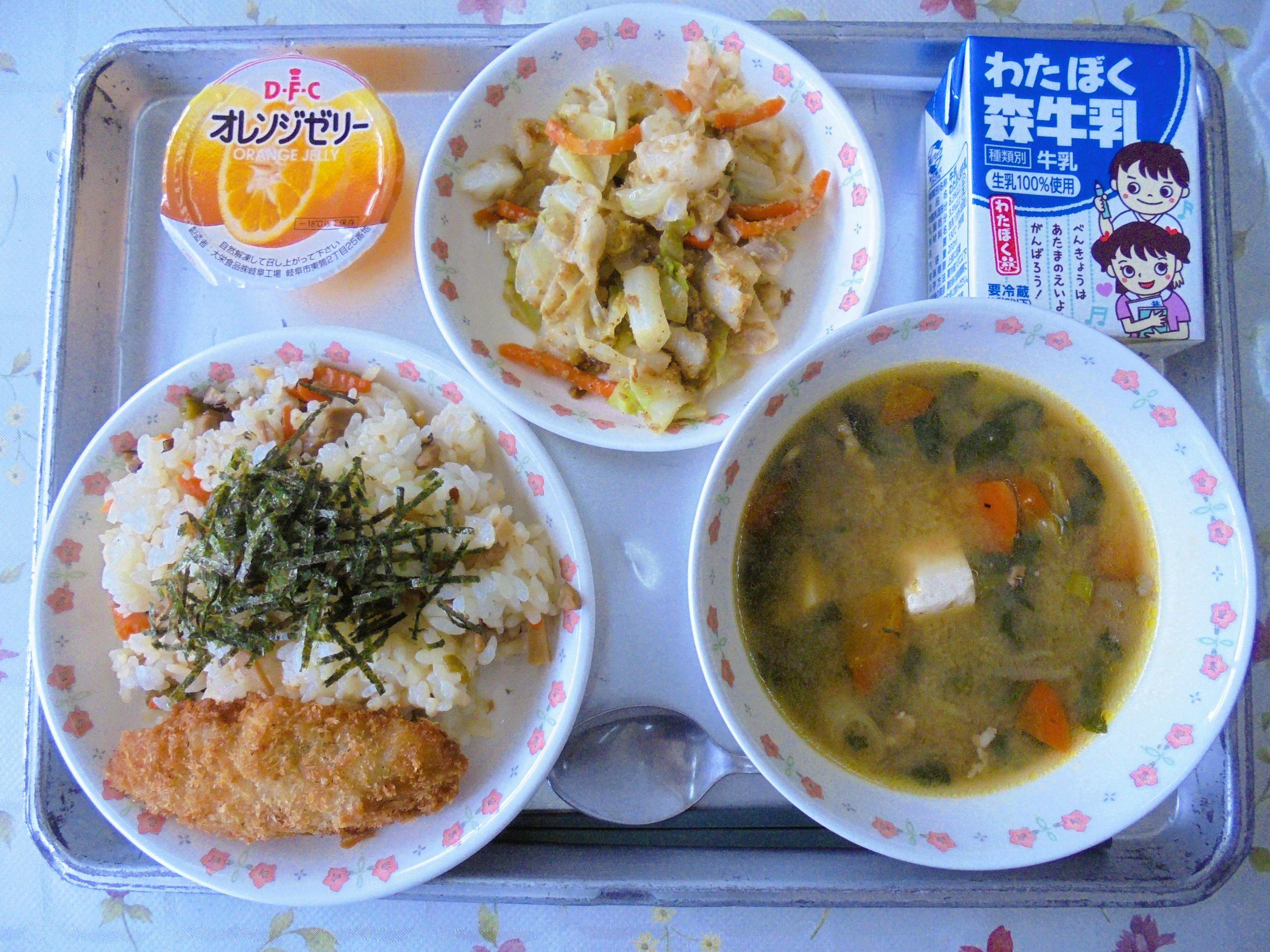 ・牛乳 ・かきまぶり ・僧兵汁 ・白身魚のフライ ・キャベツのごまあえ ・オレンジゼリー |